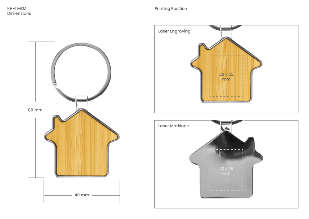 Bamboo and metal keychain house shaped, metal in shiny nickel, front side with bamboo plate, with 32mm shiny nickel flat ring.