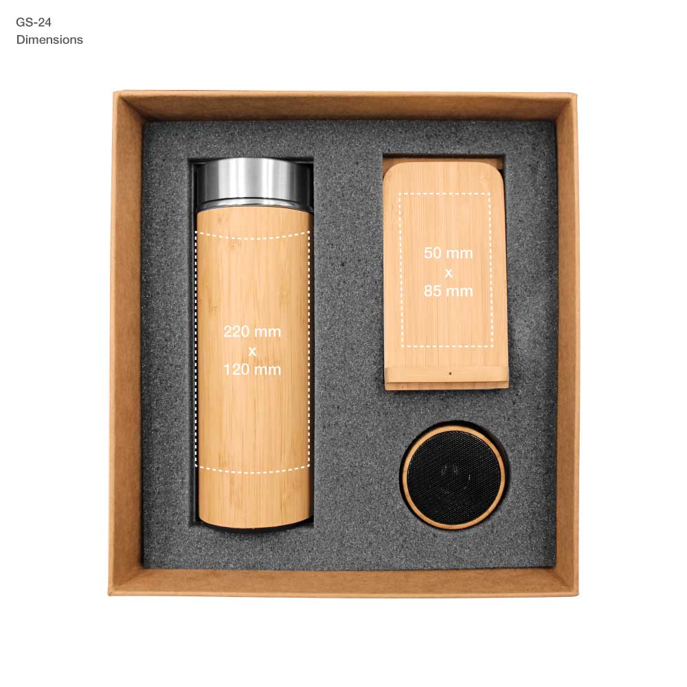 Bamboo Gift Sets GS-24: Contains 3 products as listed beside. packed in a natural-colored cardboard box with a cushion inside for product protection and ECO-Friendly presentation.