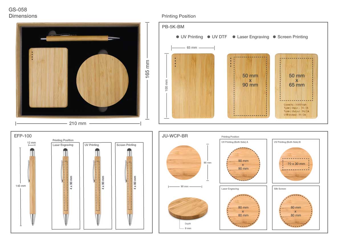 Product Combination: 1. JU-WCP-BR: Charging pad 2. PB-5K-BM: Powerbank 5000mAh 3. EFP-100: Bamboo Pen 4. GB-R: Kraft Gift Box.