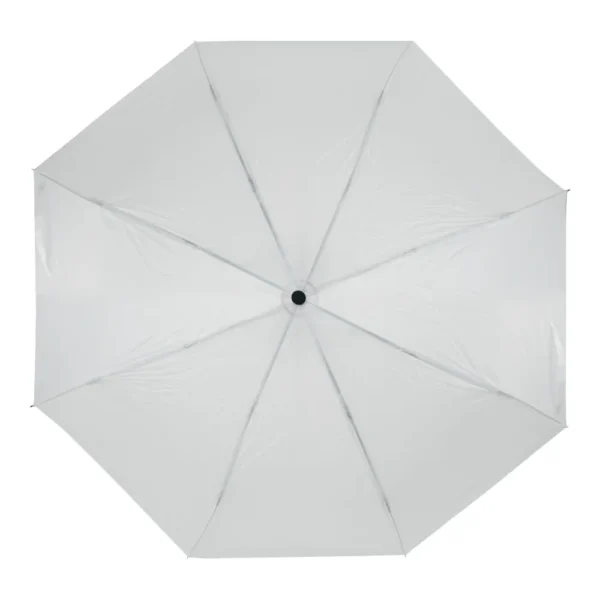 Compact and stylish 41-inch bi-fold manual umbrella in white, made from durable polyester. Includes Velcro closure and a matching pouch. Customizable with sublimation printing.