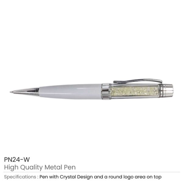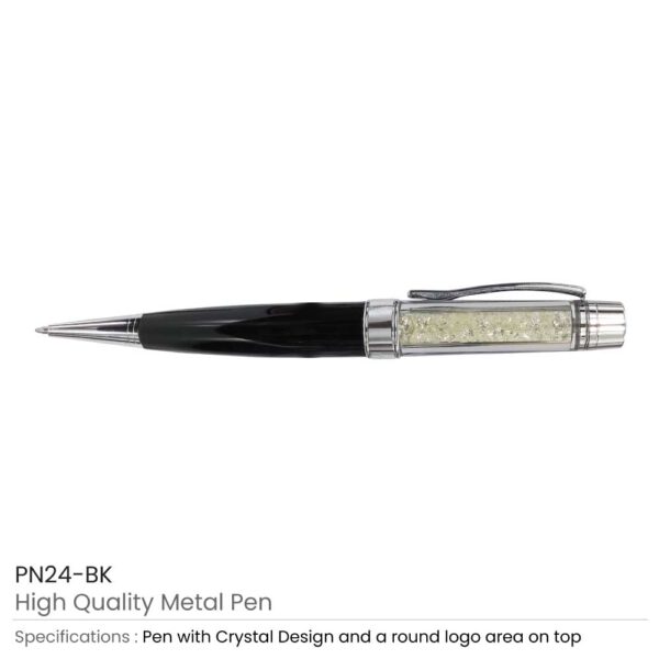 Crystal metal pens are luxurious high-quality ballpoint pens. They are created with shiny metallic material and crystals on glass. Thus, it is glossy and durable at the same time. This pen comprises a barrel. The lower part comprises glass with crystals while the upper part is black. The crystal part gives a shiny finish. Thus, making it more stylish. Apart from the barrel, it also comprises a silver tip and chrome clip. Thus, it’s a perfect promotional metal pen for business promotion. The chrome clip at the end of the pen works like a holder. Thus, you can attach the pen to your shirt or bag. There is a round logo area on the top of the pen. Thus, you can also use these promotional metal pens for events.