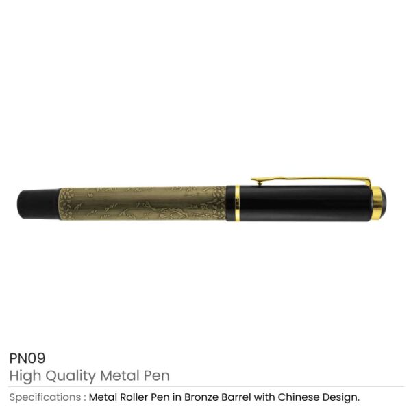 Metal pens with Chinese design grip are unique and innovative design pens. These pens had crafted with an original metallic material. Thus, they are durable and long-lasting. These pens are roller pens and a cap on them. Its bronze barrel has Chinese design patterns on it. Thus, the whole pen gives a luxurious and elegant look. The metal cap also has a gold-plated clip. The clip is attachable thus you can attach the pen to your shirt or bag. You can also use these branded pens as promotional logo pens for your brand promotion.