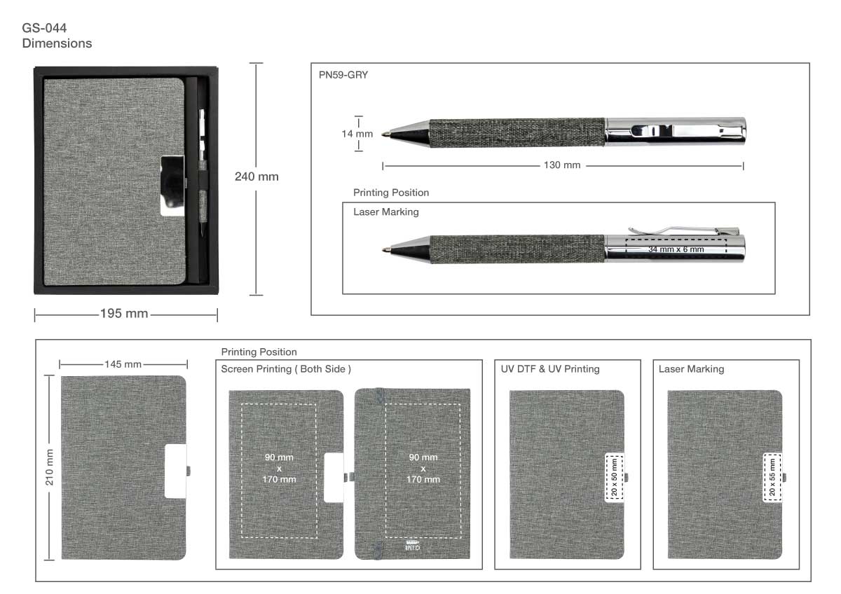 1. Notebook: A5 size, paper 70g, 96 sheets with Pen loop & elastic band. | 2. Ballpen: RPET fabric wrapped barrel, Metal Chrome cap, Clip and tip, 1.0mm Blue ink. (SKU: PN59-GRY) | 3.