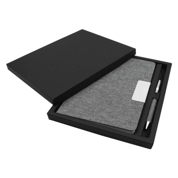 Black Cardboard gift box with cushion inside for product protection and better presentation. The product includes an A5 Size RPET Fabric Notebook. Metal pen with RPET Fabric Grip
